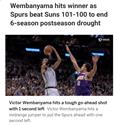 Wembanyama hits winner as Spurs beat Suns 101-100 to end 6-season postseason drought