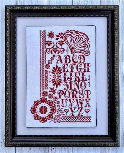 Arabesque is my Art Deco-ish contribution to the world of red samplers. This design started with the alphabet and it was so fun finding and developing motifs that had the same general feel. I love the slightly asymmetrical feel of the mandala on the bottom left and the fan in the upper right. But for me the alphabet is the star of this show! I hope you love stitching this as much as I loved designing it!