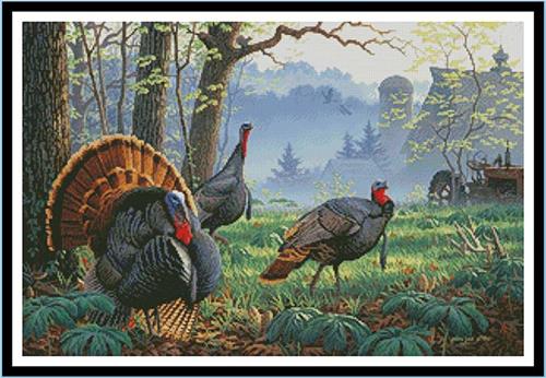 Step into the peaceful charm of a misty dawn with Foggy Morning Trio! This detailed design features three wild turkeys strutting gracefully through a fog-kissed meadow, framed by tall trees and soft morning light. With its rich colors and lifelike detail, this pattern beautifully captures the quiet magic of nature waking up at sunrise.