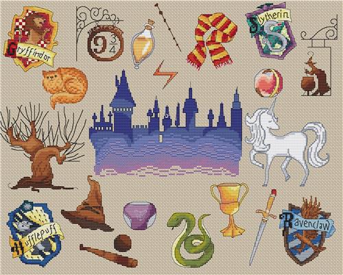 This magical design is packed with iconic symbols from a beloved wizarding world. With the castle silhouette at its center, the pattern features house crests, enchanted objects, and whimsical details like the Sorting Hat, broomstick, and unicorn. A lively and nostalgic stitch, it’s perfect for fans who want to bring a little spellbinding charm into their stitching collection.