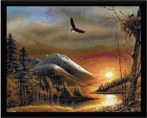 Capture the beauty of the wilderness with this breathtaking design! A soaring eagle glides across a glowing sunset sky, as snowy mountains, tall evergreens, and a shimmering river create a scene full of peace and wonder. Perfect for nature lovers, this stunning pattern brings the serenity of the great outdoors into your home—one stitch at a time.