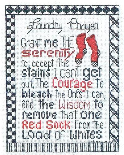 Add a little humor to your homemaking with Laundry Prayer! This playful design features a funny prayer for laundry day, complete with a quirky pair of red, black, and white socks and a cheerful border to tie it all together. It’s the perfect stitch for anyone who’s ever faced a mountain of mismatched socks with a sense of humor and a hopeful heart! Project includes full stitches, quarter stitches and backstitching.Laundry Prayer is designed to be stitched on 14ct White Aida fabric.