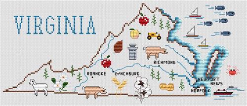 This Virginia map pattern beautifully showcases the Old Dominion’s heritage and charm. From historic landmarks and rolling farmlands to coastal ships and the Blue Ridge Mountains, it stitches together the state’s unique character. A colorful and detailed design, perfect for celebrating Virginia pride or remembering a special visit.