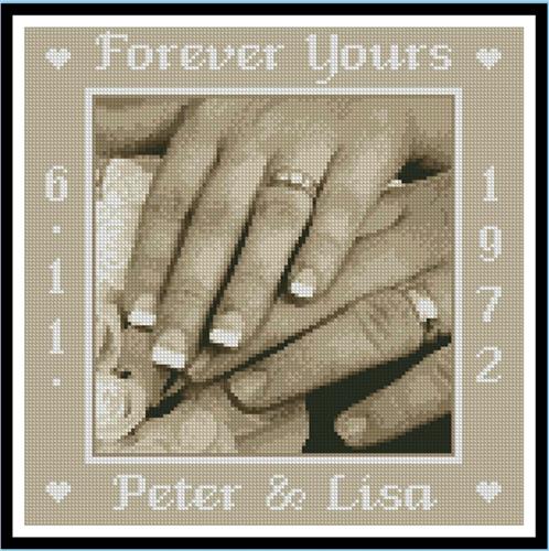 This classic wedding sampler design beautifully captures the moment of unity with two hands joined together, framed by the words “Forever Yours.” With space to personalize names and a date, it’s a meaningful keepsake that celebrates love, commitment, and the promise of a lifetime together.