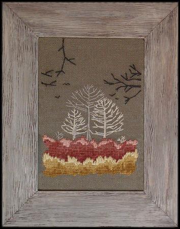 Colorful undergrowth and bare trees line the country roadway in the winter. Full stitches and straight stitches.